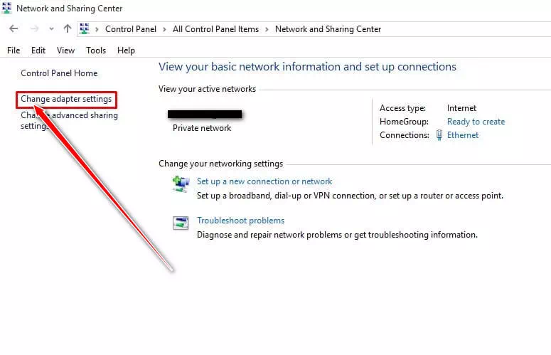 • بعد ذلك ، انقر فوق خيار (Change Adapter Settings) لتغيير إعدادات المحول.