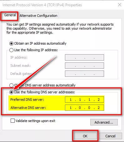 • ثمّ استخدام 208.67.220.220 في خانة :alternate DNS server.