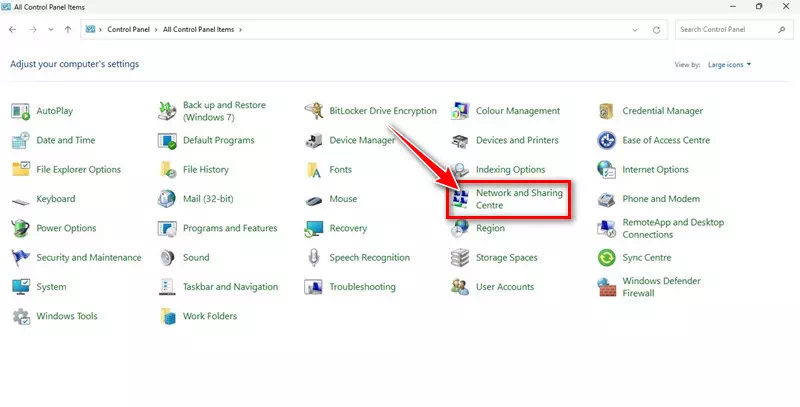 - انتقل إلى Control Panel للوصل إلى لوحة التحكم ثم حدد Network and Sharing Center للوصول إلى مركز الشبكة والمشاركة من على جهاز الكمبيوتر الذي يعمل بنظام ويندوز.