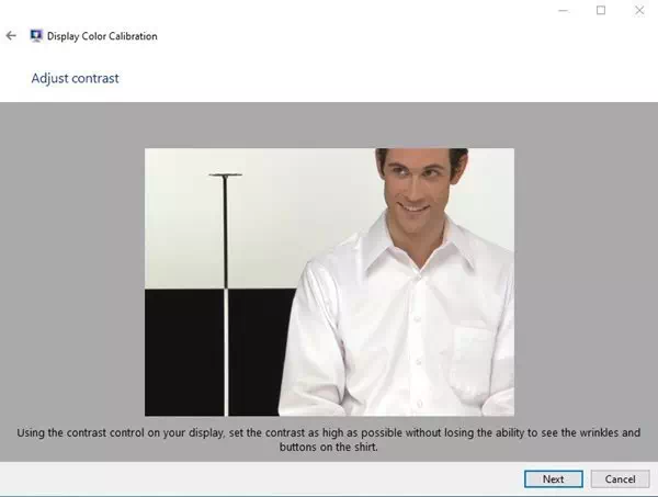 - في النافذة التالية ، سيُطلب منك (set the contrast levels) والذي يعني ضبط مستويات التباين. لذلك ، تحتاج إلى استخدام التحكم في التباين على شاشتك لضبط التباين. بمجرد الانتهاء ، انقر فوق زر (Next).