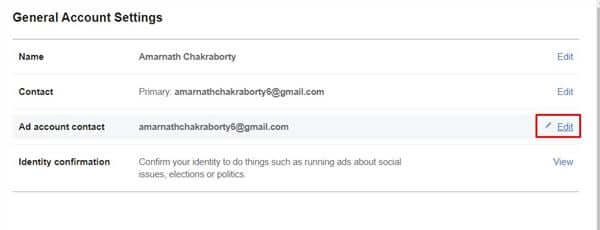 - الخطوة العاشرة. الآن افتح فيسبوك مرة أخرى وافتح خيار إعدادات الحساب العامة. بعد ذلك ، انقر فوق الزر “تعديل أو Edit” خلف جهة الاتصال. بعد ذلك ، ابحث عن عنوان البريد الإلكتروني الذي أضفته وانقر على زر “Make Primary” لجعله أساسيًا.
