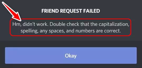 ومع ذلك ، إذا قام الشخص بحظرك ، فسترى رسالة خطأ نصها كالتالي “Friend Request Failed – Hm, didn’t work. Double check that the capitalization, spelling, spaces, and numbers are correct” والتي تعني فشل طلب الصديق – حسنًا ، لم يعمل. تحقق جيدًا من صحة الكتابة بالأحرف الكبيرة والتهجئة والمسافات والأرقام.