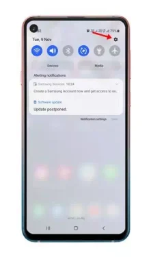 - قم بسحب شريط الإشعارات على جهاز سامسونج جلاكسي ، وانقر على زر الترس للوصول إلى الإعدادات السريعة.