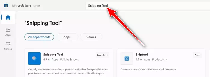 - عند فتح متجر مايكروسوفت، ابحث عن Snipping Tool.