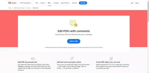 خدمة Adobe Free PDF Editor تحتاج إلى إنشاء حساب مع Adobe لاستخدام محرر PDF المجاني عبر الإنترنت. يتيح لك محرر Adobe PDF عبر الإنترنت إضافة ملاحظات لاصقة أو نصوص أو رسومات إلى ملفات PDF الخاصة بك.