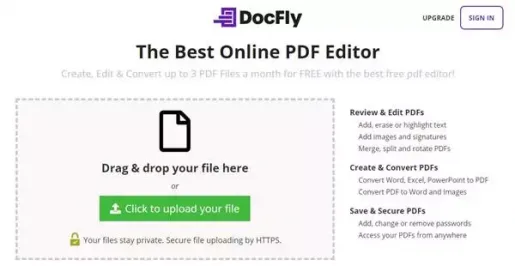موقع Docfly ليس مجانيًا تمامًا ، ولكنه يسمح لك بتحرير ما يصل إلى 3 ملفات PDF كل شهر مجانًا. باستخدام الإصدار المجاني ، يمكنك إنشاء ملف PDF وتحريره وتحويله. بالمقارنة مع أي محرر PDF آخر عبر الإنترنت ، يقدم موقع Docfly الكثير من المميزات مثل إضافة النص أو مسحه أو تمييزه. يمكنك إضافة الصور والتوقيعات وما إلى ذلك.