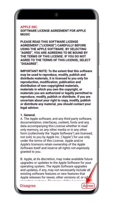 - عند فتح Apple Music لأول مرة ، سيطلب منك الموافقة على الشروط والأحكام. اضغط على زر “Agree” للموافقة.