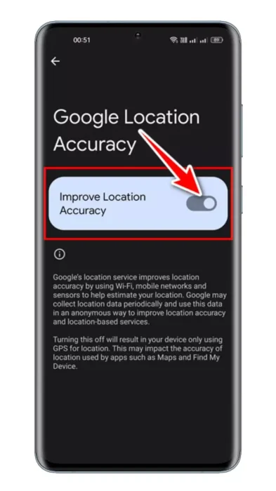 قم بالتمرير لأسفل وانقر على Google Location Accuracy - ثم في شاشة دقة الموقع من Google ، قم بتمكين مفتاح التبديل “تحسين دقة الموقع“.
