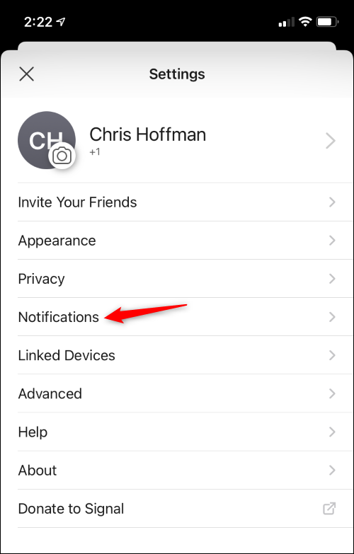 اضغط على “الإخطارات أو الاشعارات” في شاشة قائمة إعدادات تطبيق Signal.