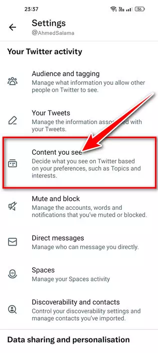 اضغط على خيار الخصوصية والأمان - ثم حدد “المحتوى الذي تراه” في خيار الخصوصية والأمان.