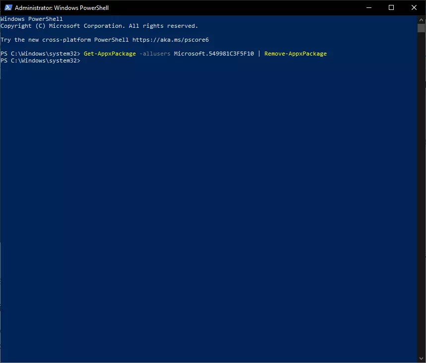 - بعد ذلك سوف تظهر لك نافذة PowerShell قم بنسخ الأمر التالي (Get-AppxPackage -allusers Microsoft.549981C3F5F10 | Remove-AppxPackage) ولصقه في نافذة PowerShell ثم قم بالضغط على زر Enter.