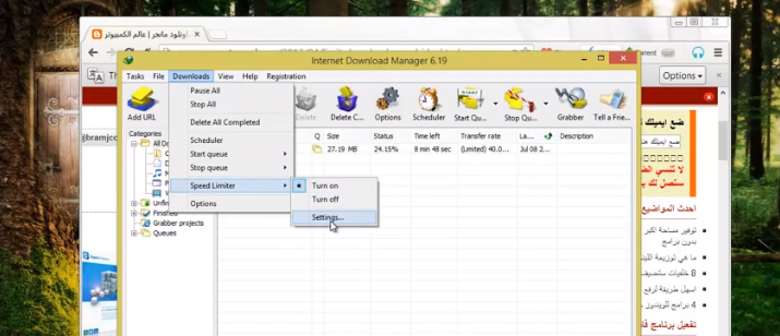 Then again by pressing setting from the drop down list corresponding to speed limiter which in turn is from the Downloads dropdown menu in the main program interface as shown in the figure below: