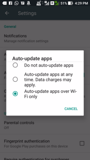 بدلاً من ذلك ، إذا كنت ترغب في منع Google من مزامنة جهازك ، فيمكنك إيقاف المزامنة التلقائية على جهاز Android الخاص بك. وقم بإيقاف تشغيل التحديث التلقائي في Google Play عن طريق زيارة الإعدادات> تطبيقات التحديث التلقائي> حدد تطبيقات التحديث التلقائي عبر WiFi فقط.