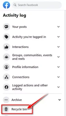 انقر فوق الزر عرض بجانب سجل النشاط - الآن، قم بالتمرير لأسفل وانقر فوق ” سلة المحذوفات ” في الجزء الأيمن أو الأيسر حسب اللغة.