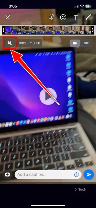 قبل إرسال الفيديو ، ستحصل على خيار تحريره تحتاج إلى النقر فوق رمز الصوت في الجزء العلوي من الشاشة - سيؤدي هذا إلى تغيير رمز السماعة إلى كتم الصوت. بمجرد الانتهاء ، أرسل الفيديو إلى الدردشة.