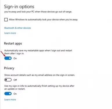 - في الجزء الأيسر ، قم بتفعيل الخيار “Automatically save my restartable apps when i sign out and restart them after i sign in” والذي يعني حفظ التطبيقات أو البرامج القابلة لإعادة التشغيل تلقائيًا عند تسجيل الخروج وإعادة تشغيلها بعد تسجيل الدخول.