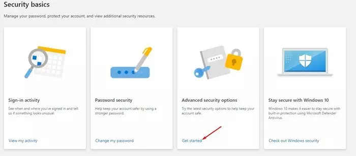 - من ضمن أساسيات الأمان ، انقر فوق الزر (Get Started) للبدء خلف خيارات (Advanced Security options) والتي تعني اعدادات الأمان المتقدمة.
