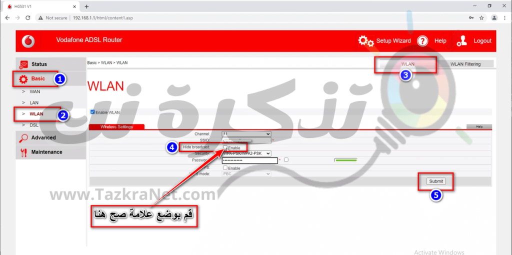 يمكنك اخفاء شبكة الواى فاى لراوتر فودافون hg532 بتباع الخطوات التالية: